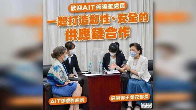 經濟部今 (24) 日透過臉書表示,新任美國在台協會 (AIT) 處長孫曉雅昨 (23) 日拜會經濟部長王美花,強調台美之間將持續合作,並深化雙邊經貿關係。