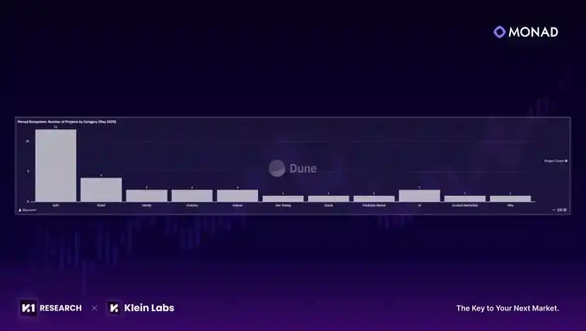 Monad 生態呈現「DeFi 為核心,多賽道協同延伸」的的模式:DeFi 類專案以 12 個的數量領跑,成為皮夾最活躍的核心賽道」的生態模式(Wallet 4)(Wallet 4 的時間領跑,成為最活躍的核心賽道用戶;個項目;同時,身份(Identity)、數據分析(Analytics)、基礎設施(Infra)等「底層基建型」賽道,以及 AI、預測市場(Prediction Market)等創新賽道均有項目落地,體現出生態從「核心金融場景」向「底層支撐 + 多元應用」的拓展邏輯。