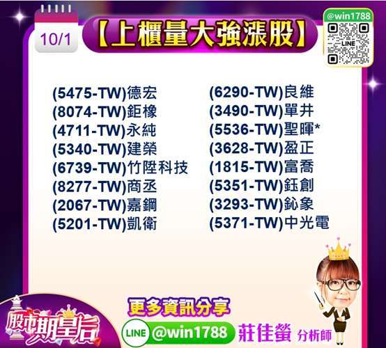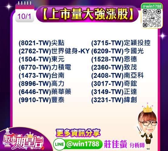 隨著 9 月營收陸續公布,以及 Q3 財報即將揭露,法人普遍看好 AI 伺服器、PCB、散熱與被動元件族群仍具表現空間,尤其在資金持續輪動下,台股有望在 AI 擴散效應驅動下維持熱度,短線雖可能高檔震盪,但中長期趨勢依舊樂觀,短線上只要指數能守住 5 日線,且未出現高檔爆量長黑,台股仍將維持「驚驚漲」格局,資金動能不宜過早預設高點,未來持續關注國安基金是否於 10 月 9 日退場、10 月 16 日台積電法說會,以及美國財報的公布、Q3GDP 上調、Fed 降息、明年的展望樂觀等,另外上市櫃公司九月營收即將公布,營收獲利好的股票依舊是盤面上留意的重點。