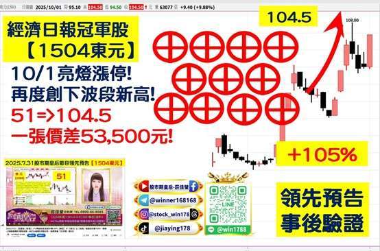 (1504-TW) 東元,51=>104.5 領先預告後大漲 +105%, 東元身為臺灣前三大家電品牌廠,同時位列全球前五大重電廠,業務版圖涵蓋電氣設備、運輸、冷凍空調與 AI 資料中心電力解決方案,受惠於 AI 伺服器及資料中心建設需求持續擴張,加上全球綠能轉型與基建投資動能,營運展望維持正向,顯示市場對 AI 電力題材的高度期待,外資 9 月持續大舉買超東元,資金明顯回流,加上基本面題材發酵,股價短線具備續攻潛力,若量能能夠延續,後市仍有機會挑戰更高價位,東元憑藉 AI 與電力基礎建設雙重題材支撐,長線成長動能明確,短線亦不乏交易契機,目標價上調至 125 元。