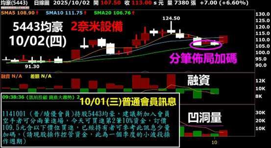 而近期鎖定的均豪 (5443-TW),正是昇陽半導體(8028-TW) 擴產的關鍵後盾。我在前兩天盤中就提醒會員,在量縮時應該積極加碼,結果今天股價果然大漲 6.6%,再度驗證「精準布局、持股精簡」的操作邏輯。