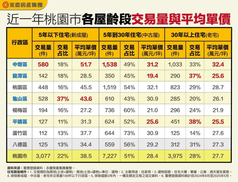 全台六都之一的桃園市成屋交易頻繁,房仲業者盤點桃園市近一年屋齡 5 年以上成屋實價登錄資料發現,「中壢區」成屋不僅平均單價高、交易量更是桃園市第一,而「龜山區」則有近 4 成交易量集中在屋齡 5 年以下的新成屋,反之「龍潭區」、「平鎮區」則是屋齡 30 年以上的老宅交易占比最高,但價格卻與屋齡 5-30 年