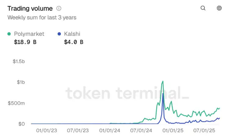 tokentermina 最新數據顯示,其總成交額已升至 189 億美元,大幅領先另一個競爭對手 Kalshi。