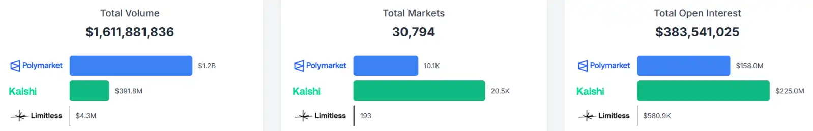 Polymarketanalytics 最新數據顯示,其總的交易者為 1349740 個,預測市場數量為 46995 個。雖然 Polymarket 在總交易額上遙遙領先領先,不過在總市場以及總未平倉部位卻落後於 Kalshi。