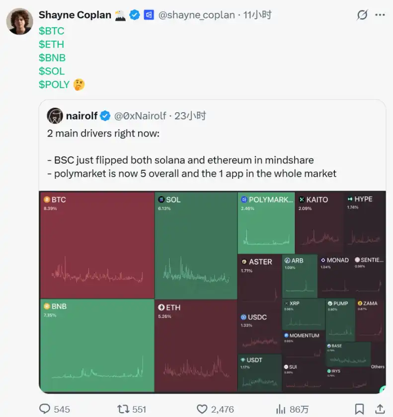 10 月 8 日,Polymarket 創始人 Shayne Coplan 在轉推時將 POLY 的代幣符號排在 BTC、ETH、BNB 以及 SOL 之後,暗示 PolyPOLY 的代幣名稱或為 PolyPOLY 的代幣名稱。不過發幣時間仍不得而知。