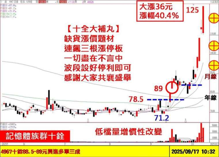 譬如相關記憶體族群,隨著 OpenAI 與韓系記憶體雙雄三星、SK 海力士建立戰略合作關係,在人工智慧 (AI) 熱潮帶動下,全球記憶體市場迎來三年來最強勁的復甦,第四季 DRAM 報價漲幅可望擴大至三成以上;就連威剛董事長陳立白也表示 DRAM 市況「好到頭痛」,DDR4 和 DDR3 這一波至少會好兩年,顯見整體記憶體缺貨漲價市況才剛開始,因此,在華邦電 (2344-TW)、南亞科(2408-TW) 及威剛 (3260-TW) 等狂飆大漲的示範下,我們 9/17 日帶領家族成員低接鎖定的十銓(4967-TW),隨即連飆三根漲停板,恭喜大家!下一檔?請跟上!