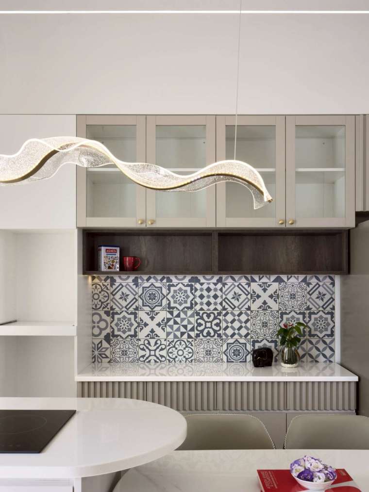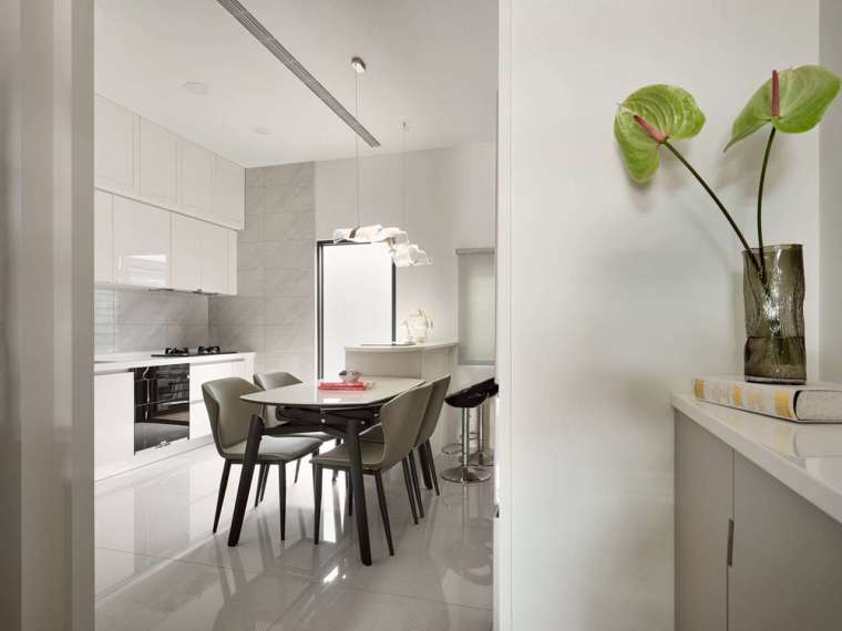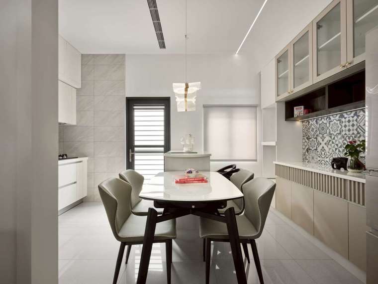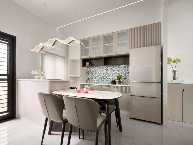 餐廳延續客廳的風格,藉由復古花磚彰顯人文底蘊,再以雲彩造型吊燈點綴天花,使整體空間在簡約氣質中,隱藏一絲輕盈的浪漫。色調明亮,布局俐落,讓每一次用餐,都能成為日常中最溫柔的儀式。