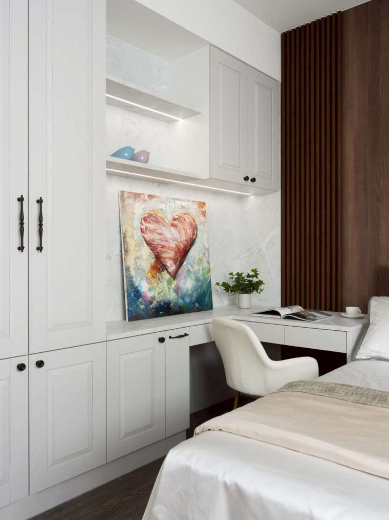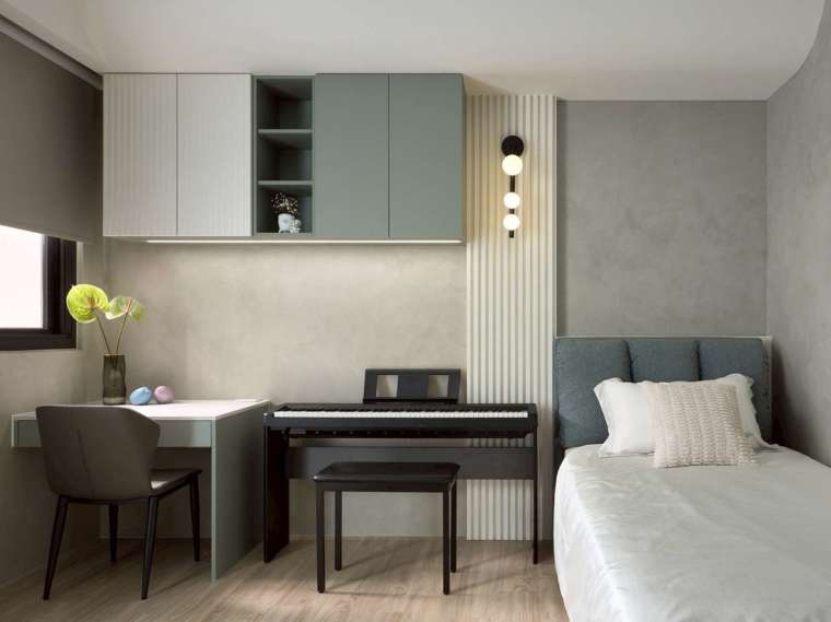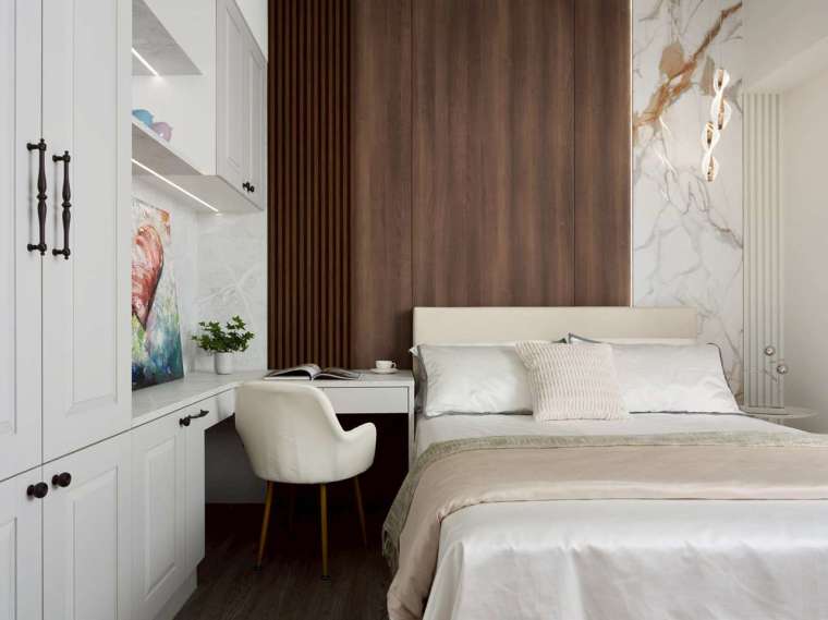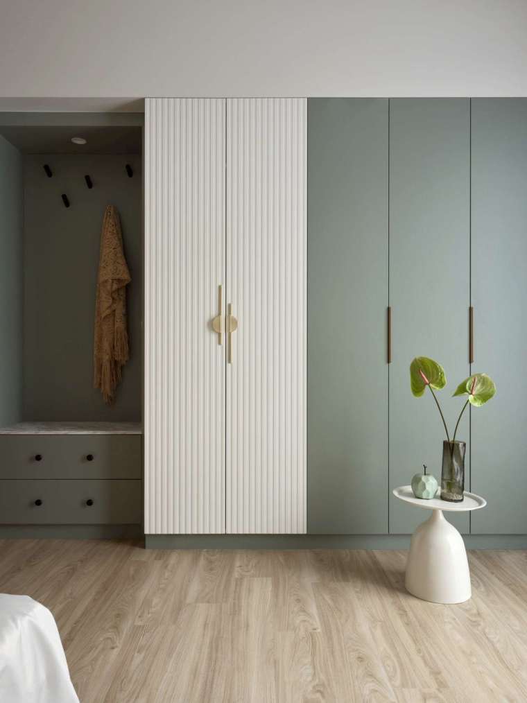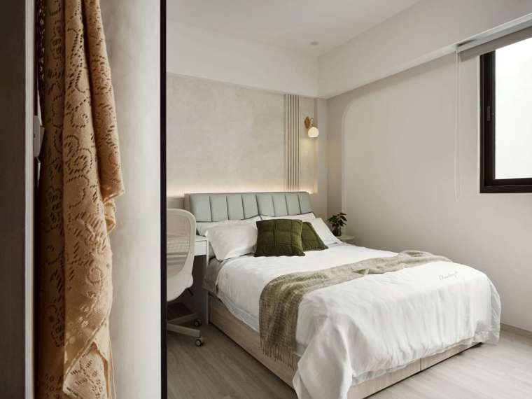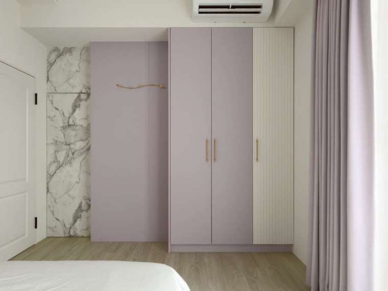 五間臥室依據使用者的不同性格與需求,各自展現獨立姿態。主臥以時下流行的奶茶色為底,輔以格柵與直線造型牆面,圓潤家具與典雅吊燈創造日系情調的靜謐沉穩。其餘四間女孩房則以馬卡龍色系與圓弧元素構築甜美,或選擇深色木紋搭配石材,展現沉著與成熟。且各房間皆有不同櫃體設計,從輕古典到現代簡約,充分展現對美感的細緻掌握與多元詮釋。