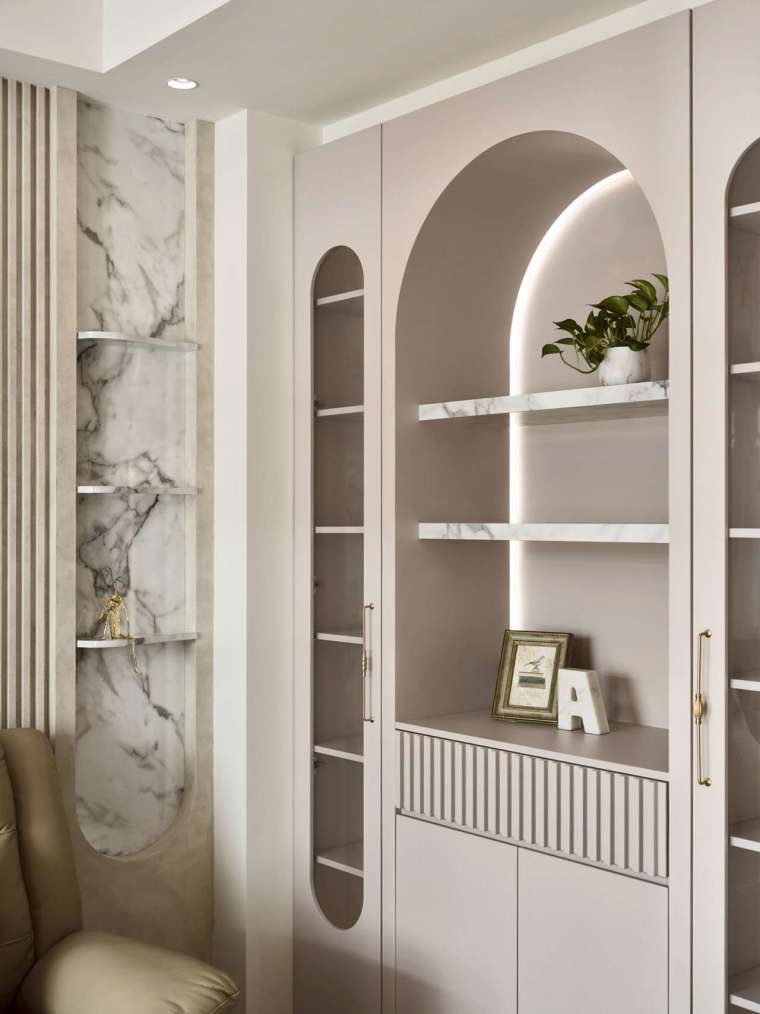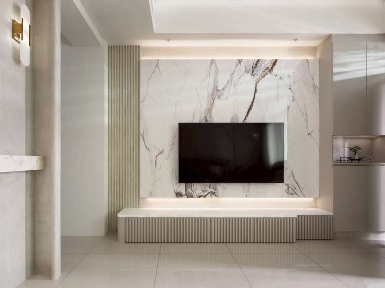 自玄關進入,視線順著空間向前展開,簡潔純淨的線條引導著動線,空氣中有著極為節制卻不失溫度的安排。客廳區以橢圓形收納櫃與層架作為視覺重點,呼應整體圓潤弧線設計,天花垂掛的藝術吊燈與大理石電視牆相互輝映,配合木格柵與線性燈條構築出豐富層次。沙發背牆則以奶茶色作為主調,搭配金屬與玻璃質地,形塑沉靜內斂的空氣感。