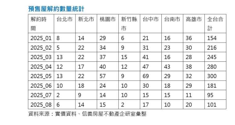 據實價資料顯示,今年 4 月受到美國關稅政策衝擊,股市出現一波大跌,連帶影響民眾的資金財富與信心,據統計當時 4、5 月預售解約數量增加,4 月解約 280 件,5 月 300 件更寫下 2023 年 7 月預售解約即時揭露的新高,不過隨股市開始回升甚至寫下歷史新高,解約件數也逐漸穩定,8 月又滑落到單月 101 件的水準。