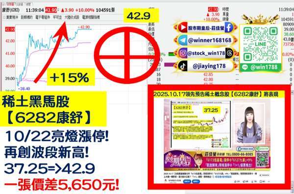 部分強勢個股逆勢抗跌,2025.10.17 佳螢在股市期皇后中公開預告的【鑽石股必勝攻略】中,第一大項的稀土概念股 (6282-TW)、亮燈漲停! 再創波段新高!