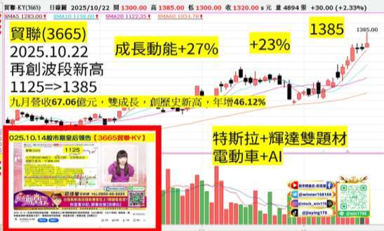 2025.10.17 佳螢在股市期皇后中公開預告的【鑽石股必勝攻略】中,GB300 擴散效應的個股,連接器 (3665-TW)貿聯 -KY,1125=>1385+23%