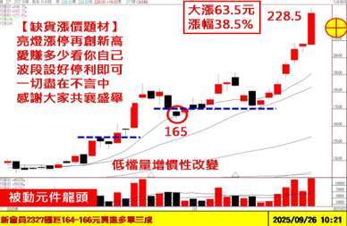 當 AI 成為剛需,零組件產能短缺已經從玻纖紗、玻纖布、CCL、PCB,進一步蔓延至 DRAM、NAND Flash,且動能只進不退之下,被動元件也跟進成為受惠元件,以及受惠於 GB200、GB300 及 AI ASIC 自研晶片拉貨啟動,帶動相關產品內涵價值提升與產品規格升級,這些都是大家可持續留意的機會;除了護國神山台積電 (2330-TW) 及 AI 伺服器龍頭鴻海 (2317-TW) 等,我們仍是看好不變外,包括這一路以來我們跟大家所分享的股票,不論是記憶體至上 (8112-TW) 今日持續大漲再創新高,價差擴大至逾 + 40%;被動元件龍頭國巨 (2327-TW) 亮燈漲停再創新高,價差擴大至逾 + 38%;被動元件二哥華新科 (2492-TW) 亮燈漲停再創新高,價差已逾 + 26%,恭喜大家!邁向富足的人生,就從超越現在的你開始,每年第四季集團年度作帳、至隔年第一季的雙軋行情,通常都是年度最好賺的機會,下一檔「年底集團作帳飆股」,我都幫你準備好了,請務必跟上!