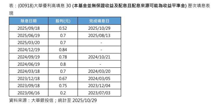 台股創高同步帶旺高股息 ETF!向來被視為「高股息 ETF 績優生」的 (00918) 大華優利高填息 30 (本基金並無保證收益及配息且配息來源可能為收益平準金)10 月 29 日收盤價 22.98 元,再度順利填息!根據大華銀投信官網統計,00918 掛牌以來配息累計達 10 次,其中共成功填息 7 次,填息實力有目共睹。