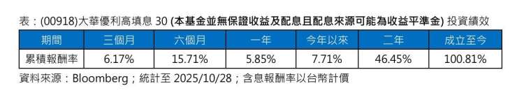 (00918) 大華優利高填息 30 (本基金並無保證收益及配息且配息來源可能為收益平準金) 經理人郭修誠指出,00918 是首檔強調填息的高股息 ETF,指數篩選流程中不僅重視股利率表現,更納入填息紀錄作為重要篩選因子,挑選兼具高股息優勢 + 強勁填息動能的成分股,因此能締造相對突出的含息報酬率表現。