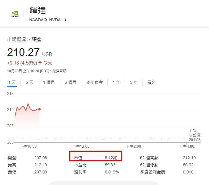 截稿前,輝達 (NVDA-US) 盤中股價上漲 4.56%,每股暫報 210.27 美元,市值暫報 5.12 兆美元。