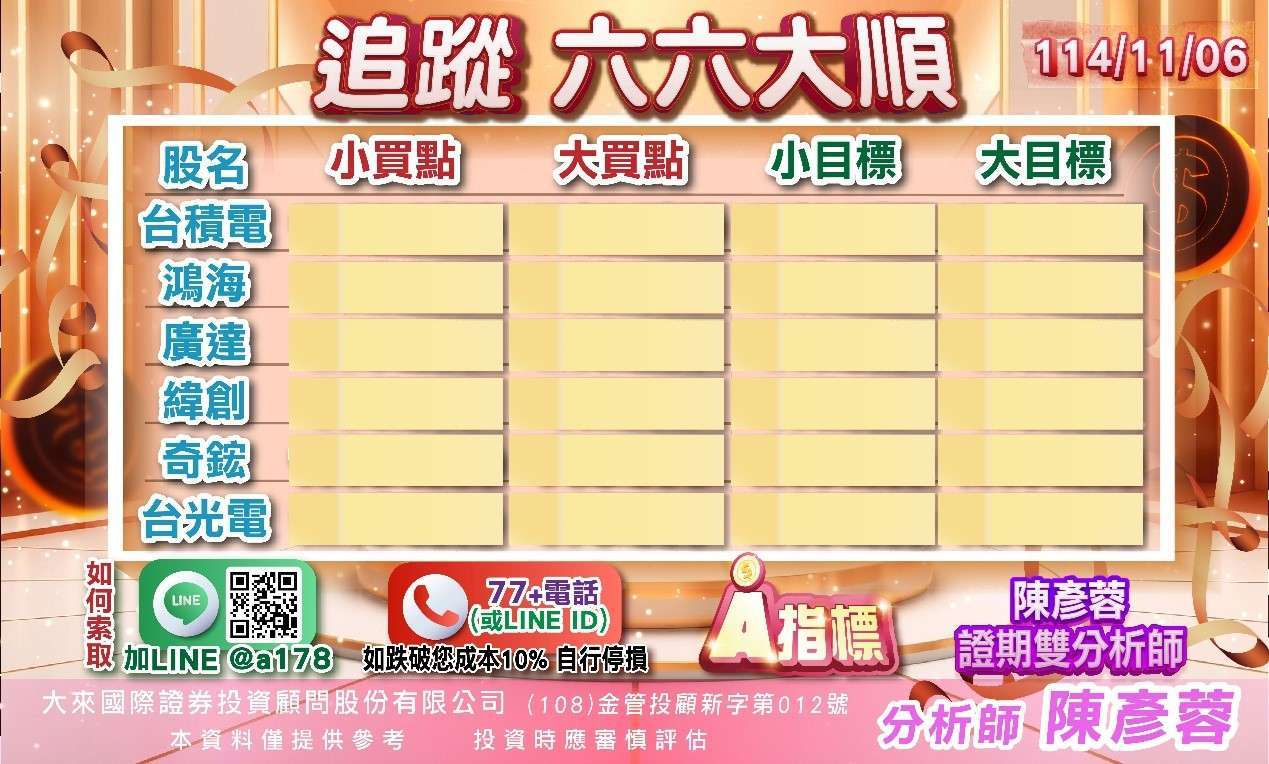中線看好 短線 台光電 (2383-TW) 奇鋐(3017-TW),拉高站賣方,廣達(2382-TW),緯創(3231-TW),回測表格小買點,有連續上漲機會? 台積電(2330-TW) 鴻海(2317-TW) 別買太早。這波奇鋐果如預告最強,會員 10 張獲利 330 萬! 這六檔股票買賣點【66 大順】表格如下,歡迎索取表格按表操課。