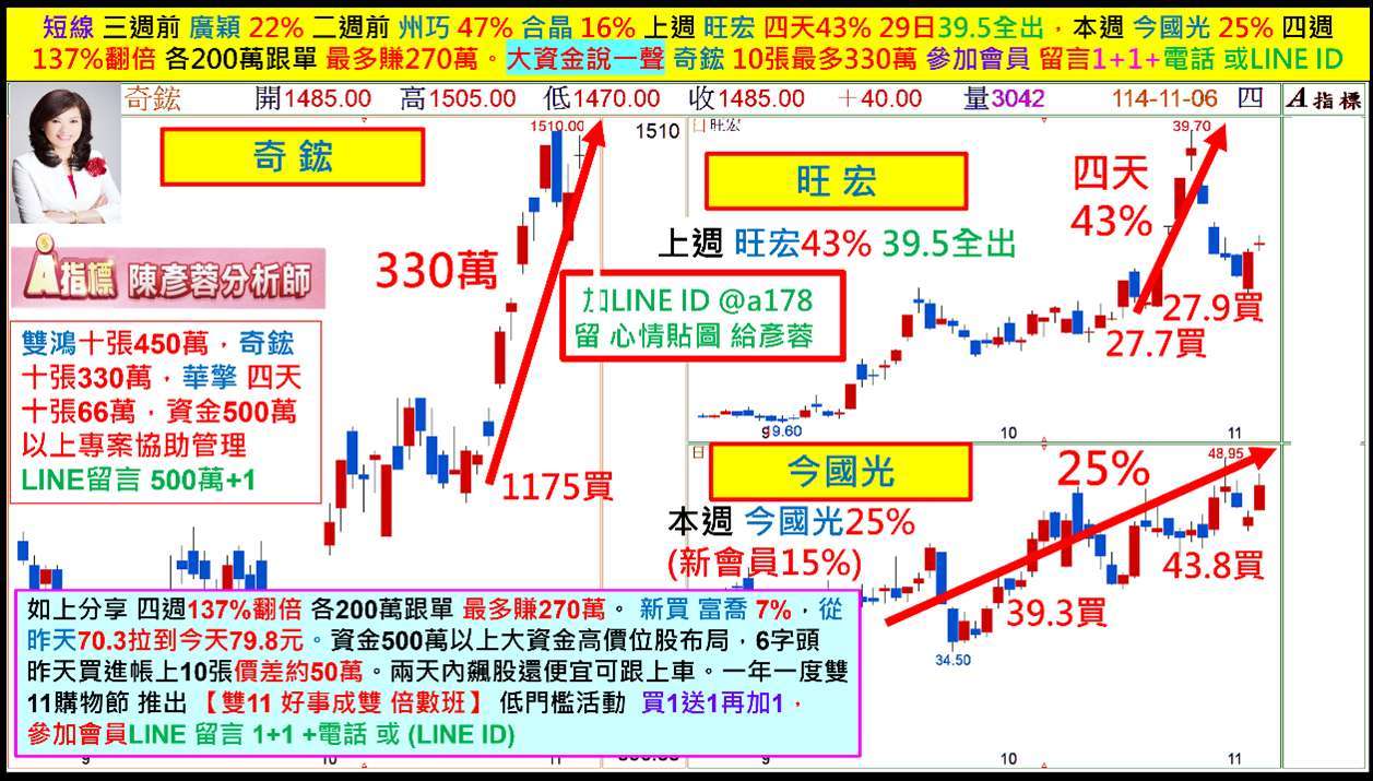 賀本欄預告 竹陞科 (6739-TW) ,德宏(5475-TW),國精化(4722-TW),金居(8358-TW),南電(8046-TW) 全部兩個月翻倍 100%。雙鴻(3324-TW)15 天大漲 309 元! 東元(1504-TW)1.5 個月翻倍 100%! 南亞科(2408-TW),華邦電(2344-TW) 全翻倍。10 月 21 日早上 7:30LINE 粉絲團預告 旺宏 (2337-TW),四天 43%! 台燿(6274-TW) 八天漲百元,11 月 6 日早上 7:30LINE 粉絲團預告 歐格(3002-TW),榮科(4989-TW) 週四漲停! 想要領先於 每天早上九點前 得知當天誰有機會連續長紅漲停? 1-2 個月後資金翻倍 100%,歡迎點下面連接 加 LINE 留言 777+1 可領先得到提醒。