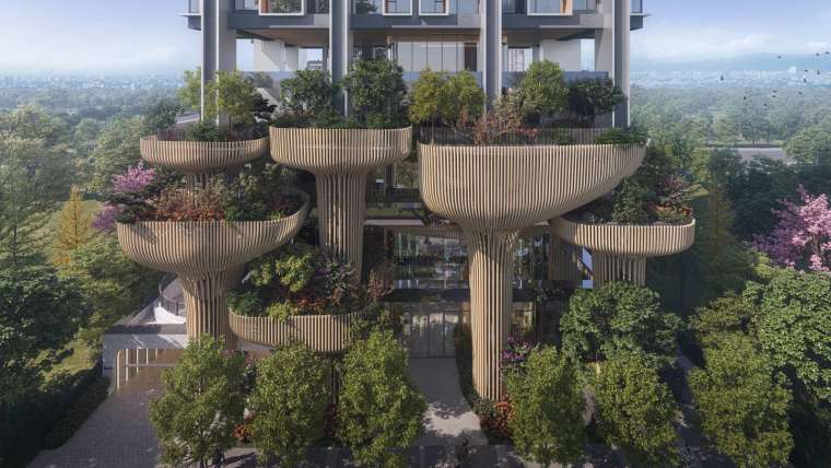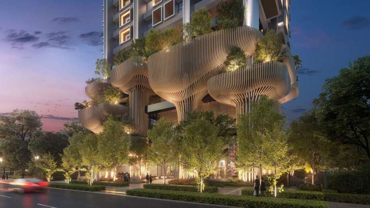 整體以垂直堆疊的量體語彙與優雅比例的樑柱結構呈現,並在公設層導入大量玻璃立面,使光影與綠意能自由穿梭於建築之間。外觀以霧面與亮面不鏽鋼板相互對比,既維持建築穩定結構,又透出流動的輕盈感。其內部公共區域採挑高複層設計,並在窗檯框景與延伸視角間,模糊室內與外部綠景的邊界,讓每一處轉身,都能感受到生活與自然並存的節奏。