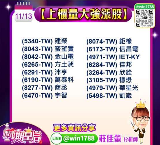同屬國巨集團的,(2375-TW) 凱美,今日亮燈漲停!MLCC 族群,(3090-TW) 日電貿、(8043-TW) 蜜望實、(2492-TW) 華新科,皆亮燈漲停!(6173-TW) 信昌電、(3026-TW) 禾伸堂,也分別上漲 6.13% 與 2.82%。