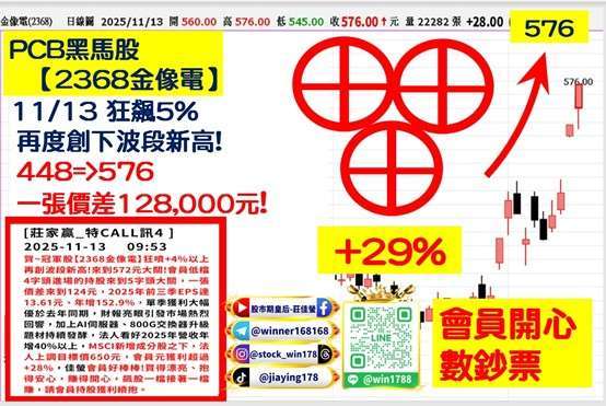 PCB 大廠(2368-TW)金像電,456.5 => 576 領先預告後大漲 +29% ,獲納入 MSCI 台灣指數成分股,成為市場焦點,公司前十月營收達 490.29 億元,年增 53.14%,創同期新高,顯示 AI 伺服器與高階網通產品需求強勁,金像電專注於 AI 伺服器主板及 800G 高速交換機用 PCB,並成功打入北美 CSP(雲端服務供應商)供應鏈,其多層板產品具高傳輸效率與優異良率,競爭力明顯優於同業,預期第四季營收可望持平或優於第三季,全年營收表現有望再創高,AI 伺服器需求推升高階銅箔基板 CCL 及 PCB 供不應求,長線仍可關注具高階材料技術及與美系 CSP 合作的 PCB 族群,後市成長潛力可期,中信證券上看 720 元目標價。