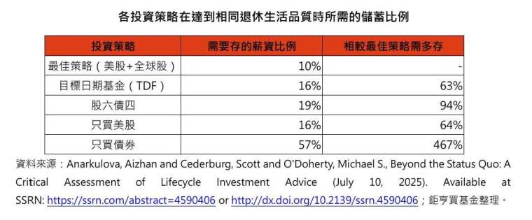 研究模擬了一對夫妻在不同變數和經濟狀況下的完整人生,包含薪水變動、失業可能、不同壽命長短、通膨與醫療支出,並把「退休金會不會先用完」視為真正的風險。結果顯示,傳統的股債邏輯看似穩健,但從生活品質的角度來看,反而可能讓退休前需要承擔更高的儲蓄壓力。
