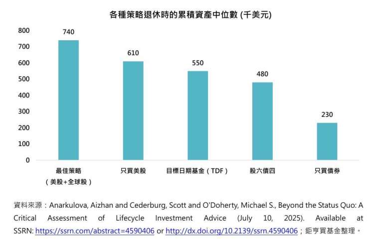 研究推導出的最佳組合是將約三分之一投入美國股票,其餘三分之二配置全球股票。在此配置下,退休時的資產中位數約為 74 萬美元,明顯高於股六債四的 48 萬美元,更遠勝只買債券的 23 萬美元。