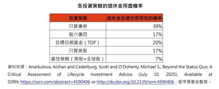 研究追蹤的一百萬種不同退休人生中,債券策略反而是最容易讓退休金提前用完的,一共高達 39% 的人可能在過世前就把錢花光。連傳統的大眾配置──股六債四和目標日期基金──也有將近兩成的機率會遇到資金不足。反倒是看起來風險較高的股票配置,特別是全球股票,提前用完退休金的機率僅有近 7%,是所有策略中最穩健的。