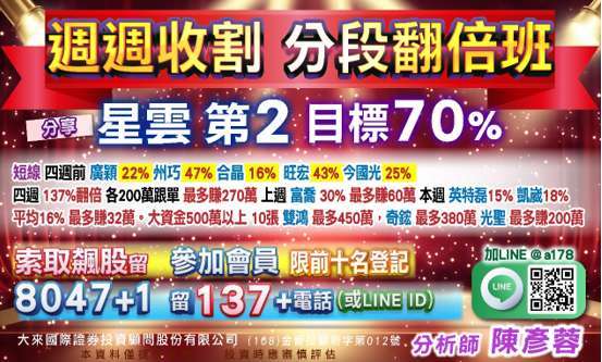 預告 星雲 (8047-TW),一個月翻倍 140%。【星雲 第 2】,即將發動目標翻倍,加 line 留言【777+2】索取。