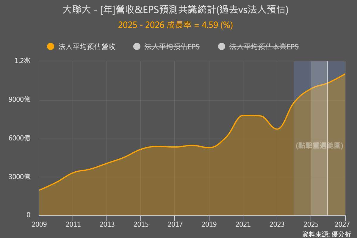大聯大的成長策略已從單純追求「分銷規模」,轉向強化「AI 與供應鏈整合平台」的角色定位。受惠於 AI 伺服器與邊緣運算 (Edge computing) 需求的持續推升,法人看好公司營收前景。法人預計大聯大 2026 年營收將達到新台幣 1.03 兆元,有望突破兆元大關,較 2025 年預估的 9,866 億元成長 4.6%。