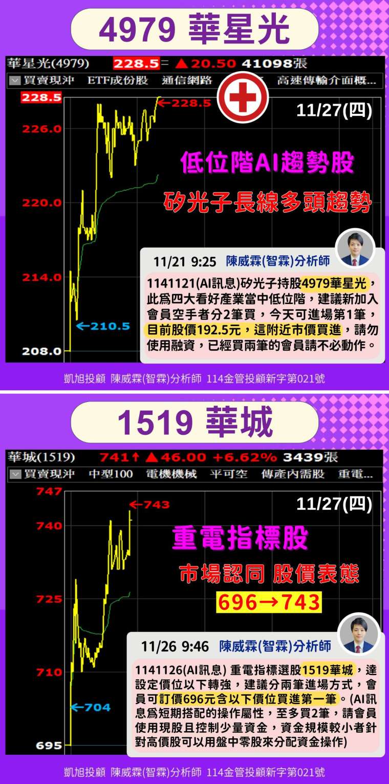 第三個亮點則是連續強調的電源轉電力,AI 伺服器帶來的用電缺口愈來愈大,美國科技廠急著補電力,相關設備自然會受惠,昨天我們帶會員買進華城 (1519-TW),今天馬上強勢大漲,顯示電力設備的需求正在加速。