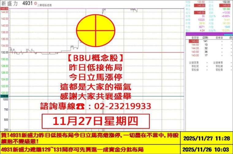 BBU 概念股新盛力 (4931-TW):昨日 130 元低接佈局,今日立馬開心賺漲停,恭喜!昨日有來電預約、或私訊我的粉絲好友,這都是大家的福氣,感謝大家共襄盛舉!