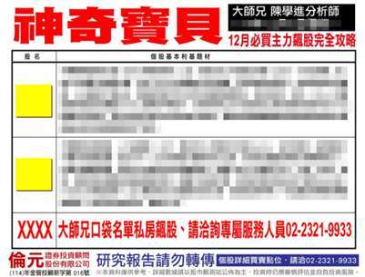 迎接 12 月最好賺的一個月,如果你不知道該如何選股,沒關係大師兄幫你找好了,歲末年終不必看老闆臉色,年終紅包自己賺,二檔可以歐印『翻身致富』的機會,獨家限量 100 份開放免費索取,好東西只跟好朋友分享,火速免費索取【12 月必買名單】