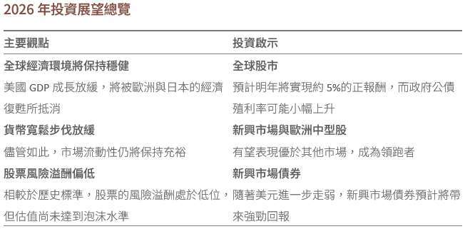 在 AI 投資循環延續與供應鏈資本支出外溢的帶動下,全球股市在 2026 年有望維持正報酬,其中新興市場不僅受惠於科技需求與美元走弱,加上當地資本市場成熟與基本面改善,預計將成為表現最亮眼的資產類別。相對之下,已開發國家政府公債殖利率可能在通膨與財政赤字壓力下小幅走高,而美元則在利差收斂與政策不確定性下持續偏弱,促使資金重新評估股、債與匯市的整體配置。