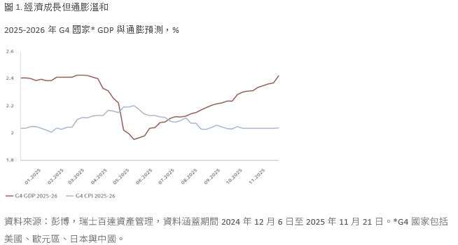 未來一年,全球經濟將處於某種程度的「甜蜜點」,這可能反映在股市的表現上,我們預計 2026 年全球股市 (註 1) 報酬率約為 5%。我們預測,全球 GDP 增速將達到 2.6%,大致與長期經濟成長率吻合,這將有助於抑制通膨壓力。事實上,投資者更加樂觀看待經濟成長;對通膨的悲觀情緒則有所緩解(見圖 1)。同時,約 85% 的央行在政策上採取寬鬆立場,而私部門的放款也在逐步增加。穩健的經濟成長加上流動性的帶動,為風險資產類別提供了有力的支撐。