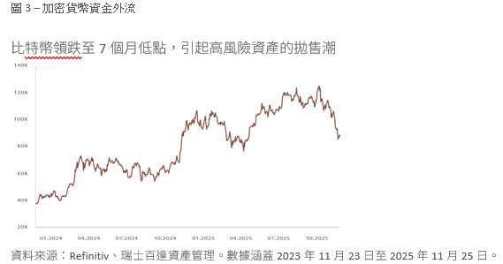 比特幣波動劇烈,10 月一度突破 12 萬美元歷史新高,隨後卻急跌,幾乎抹去全年漲幅。隨著加密貨幣市場流動性下滑與總經不確定性升高,這項被視為高風險資產指標的加密貨幣出現猛烈拋售(見圖 3)。