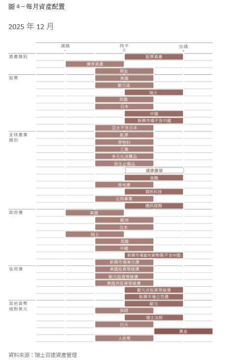 黃金仍然是具有戰略意義的避險資產,因此我們選擇在多元資產組合中保持高達 5% 的超配。然而,經歷了 2025 年的亮眼表現後,黃金的進一步漲幅可能會較為溫和,因為美國通膨可能在 2026 年上半年達到高峰,而經濟成長則預計在下半年回升。