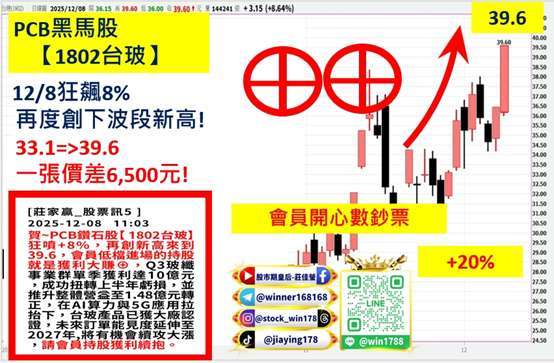 (1802-TW)台玻,33.1=>39.6,領先預告後大漲 20%,為台灣玻璃龍頭,主力涵蓋平板玻璃、玻纖布及器皿製造,基本面穩健,隨 AI 產品高速傳輸需求增加,上游 T-glass 玻纖布供給緊張,帶動玻纖布族群股價走強,受 (1303-TW) 南亞 CCL 與 PP 產品調漲 8% 帶動,中國大廠跟進,法人看好台玻產品涵蓋玻纖布、平板玻璃,與 CCL、PCB 及 AI 伺服器供應鏈相關,可同步受惠。