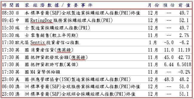 上週五全英房屋抵押貸款協會數據顯示,12 月英國房屋價格意外較前月跌 0.4% 及較去年同期漲 0.6% 為 2024 年 4 月以來最低漲幅,打壓英鎊兌美元至 1.3431 低點。隨後 S&P 全球調查英國 12 月製造業 PMI 終值 50.6 遜於初值,仍以十五個月最快速增長,新訂單則 2024 年 9 月以來首見增長,推升英鎊兌美元至 1.3501 高點,但企業樂觀情緒三個月來首跌,引發英鎊回落。預估今日英鎊兌美元阻力於 1.3440-60,支撐於 1.3350-70。