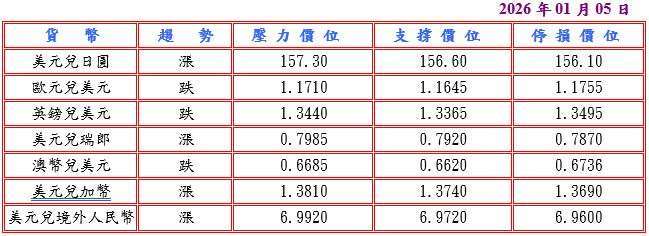 隨著美國與其他主要經濟體之間的利率差距縮小,加上美國財政赤字、全球貿易戰及對美國聯邦準備理事會 (FED) 獨立性的擔憂,給市場蒙上陰影,2025 年拖累美元兌大多數貨幣疲弱,更可能在 2026 年持續困擾美元,打壓美元兌日圓至 156.51 低點,但數據顯示標準普爾 (S&P) 美國 12 月製造業採購經理人指數 (PMI) 終值為 51.8 與初值持平,而且美國本周將公布包括非農業就業報告等大量數據,將提供 FED 會否進一步降息的線索,限制美元兌日圓走低。預估今日美元兌日圓支撐於 156.40-60,阻力於 157.30-50。