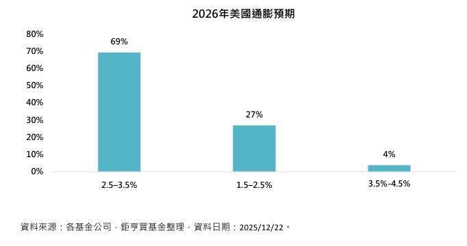 值得注意的是,基金公司對 2026 年通膨的答案高度集中在 2.5–3.5%(18 家,約 69%), 其次才是 1.5–2.5%(7 家,約 27%)。這樣的分布不只是「通膨會不會降」的問題,更像在 透露一個更深層的共識:市場對美國通膨的想像,可能正在從疫情前的低通膨框架,移向「2.5 3.5% 成為較常態、且經濟可運作的區間」。