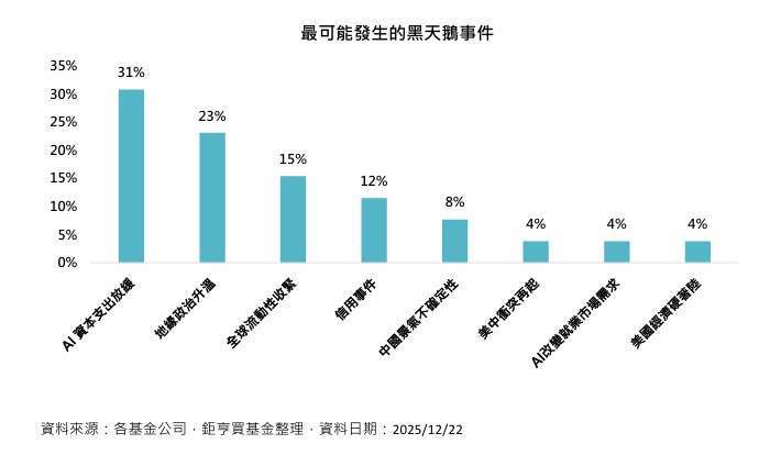 至於黑天鵝風險,答案其實非常集中在兩大類:第一是成長主線本身的變數——「AI 資本支 出放緩」被 8 家(約 31%)點名;第二是外部衝擊——「地緣政治升溫」被 6 家(約 23%) 點名。接下來才是「全球流動性收緊」4 家(約 15%)、「信用事件」3 家(約 12%),以及 「中國景氣不確定性」2 家(約 8%)。換句話說,即便機構對明年主線偏正向,他們最擔心的 仍是:AI 這條引擎如果降速,或外部衝擊讓市場風險偏好急轉彎,資產評價會很快重新定價。