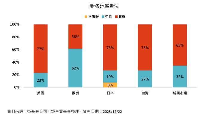 區域看法也呼應同樣的分布:美國 20 家(約 77%)看好,日本與台灣各 19 家(各約 73%) 看好,新興市場 17 家(約 65%)看好;歐洲則以中性居多(16 家,約 62% 中性;10 家, 約 38% 看好)。簡而言之,基金公司不是否定歐洲,而是相對保留;而更被一致點名的,是能 見度較高、與主線連動更強的市場。