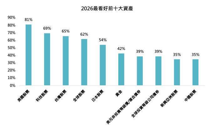 那麼,基金公司把「故事」最後落在哪裡?從「最看好的資產(多選)」可以看出資金偏好相當 清楚:美國股票 21 家(約 81%)最高,科技股票 18 家(約 69%)其次,台灣股票 17 家 (約 65%)、全球股票 16 家(約 62%)、日本股票 14 家(約 54%)緊跟在後。這意味著 股票仍是多數機構的主戰場,而「美國+科技」仍是最核心的配置語言,台灣與日本則更像是 這條主線延伸出去的受益市場。