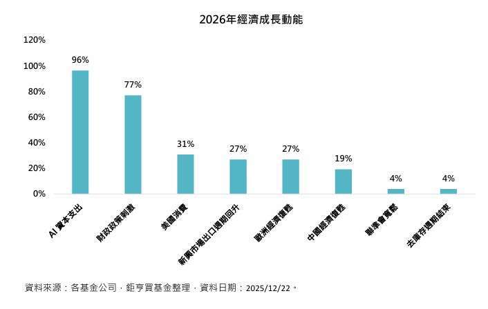 在所有選項中,最接近「共識到不能再共識」的一題,是 2026 年的成長動能。26 家裡有 25 家(約 96%)把「AI 資本支出」列為主要成長引擎,遠高於其他選項;第二高的是「財政政 策刺激」,有 20 家(約 77%)選到。相較之下,「美國消費」只有 8 家(約 31%)提及, 新興市場出口週期回升與歐洲經濟復甦各 7 家(各約 27%)。換句話說,基金公司更願意相 信 2026 的經濟推力來自企業端持續投資與政策端維持底盤,而不是押注消費突然再加速或 某個區域全面翻身。