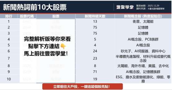 近期國際股市氛圍轉佳,美國 11 月 CPI 數據低於預期,加上 Fed 官員釋出鴿派訊號,市場對於 12 月降息的預期升溫,帶動風險資產偏好提升。美股 AI 族群止跌強彈,台積電 ADR 上揚,為台股注入強心針。盤面結構上,資金不再單壓 AI 伺服器,而是擴散至「泛 AI」領域,包括特斯拉執行長馬斯克提出的「太空 AI」藍圖,直接引爆衛星與太陽能族群的補漲行情。