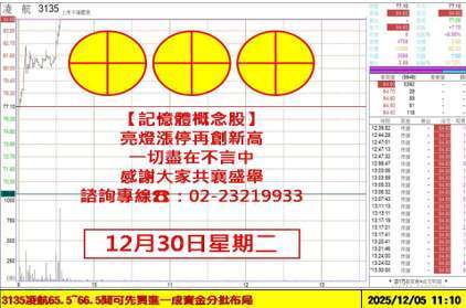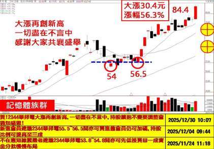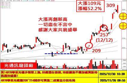 就像我們鎖定的記憶體族群華邦電 (2344-TW),11/24 日 54 元及 12/4 日 56.5 元全力鎖定之後,今日大漲再創 84.4 元新高,一張價差達 + 30.4 元、價差獲利達 56.3%;記憶體概念股凌航(3135-TW) 也是一樣,12/5 日 65.5 元鎖定之後,立馬連飆三根漲停板,恭喜大家!包括矽光子華星光 (4979-TW) 從 11/26 日 209 元全力鎖定之後,今日大漲再創 309 元新高,一張價差達 + 109 元、價差獲利達 52.2%;ASIC 設計世芯 - KY(3661-TW)更是連賺二趟,第一趟從 2950→3485 元,一張價差達 + 535 元、價差獲利達 18.1%,第二趟從 3140→3550 元,一張價差達 + 410 元、價差獲利達 13.1%,真的是太棒了!一切盡在不言中,感謝大家共襄盛舉。