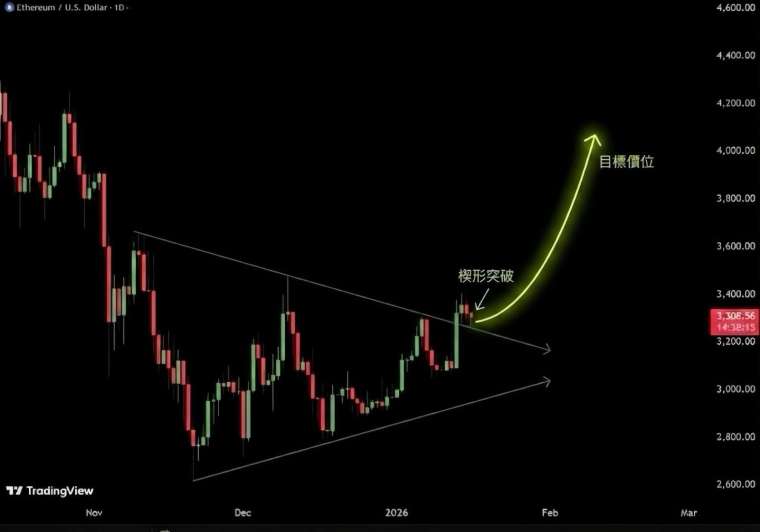 這個目標價位並非憑空猜測,而是根據測量目標法推算得出,即將三角形最寬處的垂直高度疊加到突破點上。若此形態成真,乙太坊將迎來一波淩厲的主升浪,這不僅是價格的回歸,更是市場信心的全面修復。