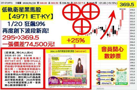 光通訊族群再度噴出,指標股 (4971-TW)IET-KY 英特磊,295 => 369.5 領先預告後 +25%,今日強勢亮燈漲停,續創歷史新高,英特磊受惠於磷化銦磊晶產品在 AI 伺服器與低軌衛星的應用需求旺盛,2026 年相關營收占比有望衝上 60%,市場看好其毛利率將提升至新高度,股價有望挑戰 400 元大關。
