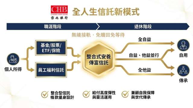 彰化銀行表示,透過制度整合與流程設計,信託不再是人生某一時點的安排,而是橫跨在職累積、退休安養、風險防護與財富傳承的長期陪伴。近年來,彰化銀行持續透過契約設計優化、數位工具導入與跨領域資源整合,推動信託服務從單一產品,轉化為貼近人生節奏的整合型金融服務。